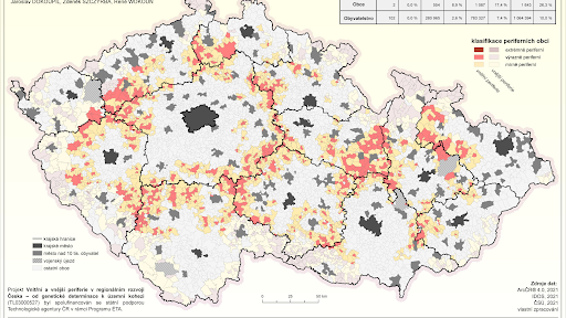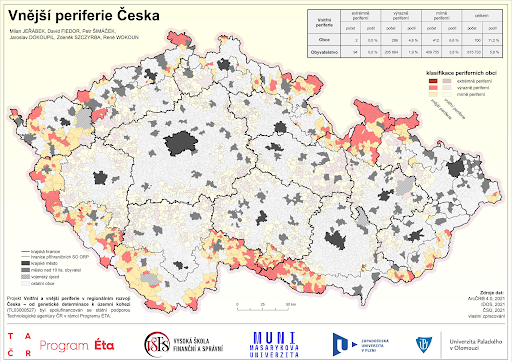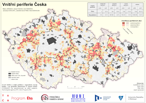Realizovaný projekt pohlíží multioborovou optikou na faktory determinující rozdíly mezi periferními lokalitami osídlení a jejich jádry. Projekt komplexním způsobem hodnotí výskyt, míru a dopad faktorů působících na periferní oblasti, a to jak na vnější, tak vnitřní. Na základě socioekonomické analýzy jsme vymezili vnitřní a vnější periferie Česka na úrovni obcí, vytvořili přes 60 podkladových map a následně mapy těchto periferií na úrovni obcí. Vytvořili jsme metodiku k posílení územní koheze při krajských a státních hranicích Česka, formulovali návrhy, opatření a doporučení za účelem zvýšení územní koheze a návrhy opatření na legislativní úrovni. Přínosem je tak komplexní a multidisciplinární přístup při socioekonomické analýze vnitřních a vnějších periferií, jejich hranic, analýze rozvojových dokumentů a doporučeních pro řešení rozvojových problémů vnitřních a vnějších periferií.